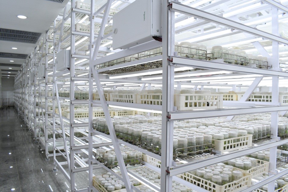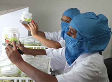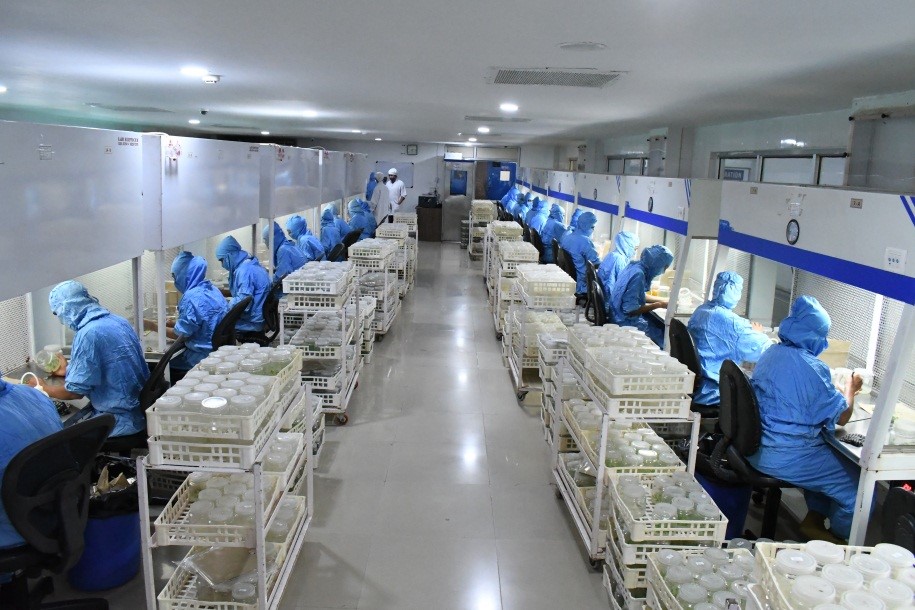 Our State of the Art plant tissue culture laboratory is one of the well-designed and fully compliant to the Department of Biotechnology, Government of India guidelines. The Laboratory is bifurcated into sterile and Non Sterile areas. Plant Inoculation Room, Media Storage room and Growth Rooms are in sterile area (Class 10,000 & 100,000). In the non-sterile area the sections like Media preparation area, Autoclave Room etc. are operating. Apart from that, semi-automatic bottle washing and rinsing machines, Reverse Osmosis system coupled with demineralization unit to provide water with required purity levels are also part of our High-Tech venture. A captive power generating unit for 100% power back up is also provided to meet any eventuality.